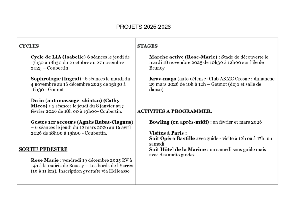 ANNEE 2025-2026 : ACTIVITES et CYCLES